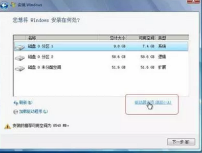1、进入到分区界面,点击“驱动器选项(高级)”。