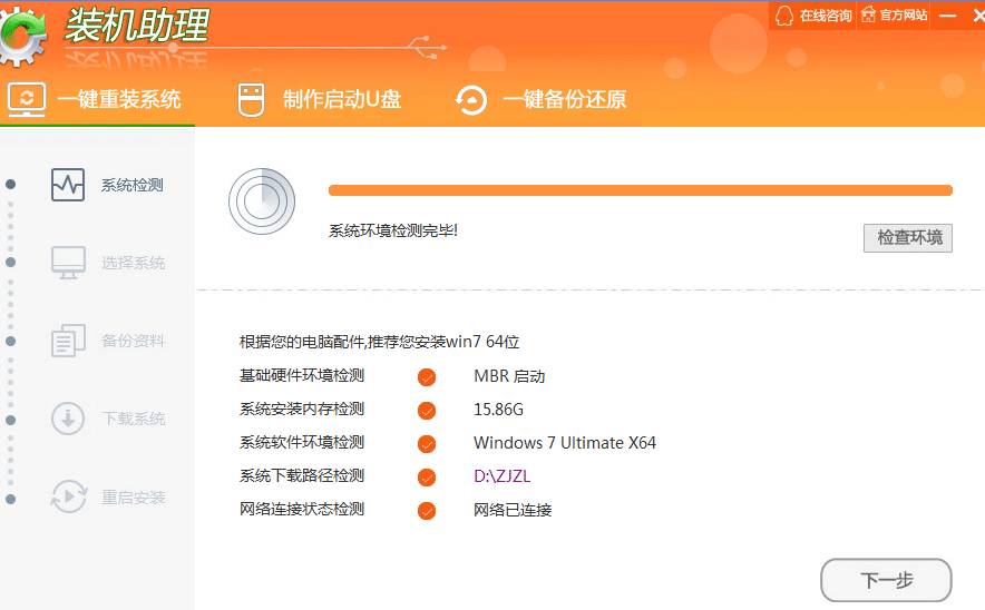 第一步 系统检测。下载软件完软件后正常打开(“一键重装系统”), 程序会默认检测当前系统环境,检测完成后,点击“下一步”。