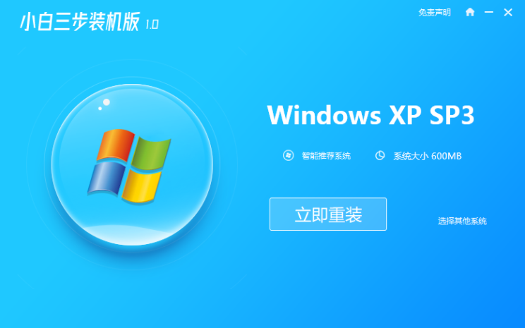 1、浏览器搜索小白官网下载并打开小白三步装机版软件,选择xp系统,点击立即重装。