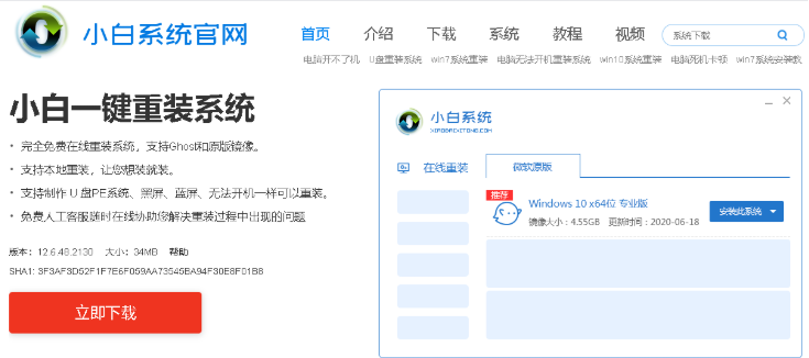 1、首先下载新版的小白一键重装系统,直接进入首页单击下载。