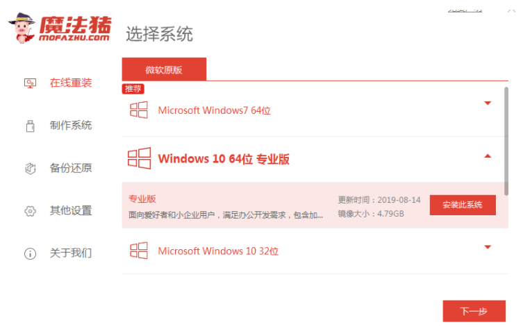 1.点击下载“魔法猪”系统,点击在线重装,选择我们需要的系统,点击安装这个系统。