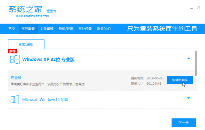 1.首先将安装系统之家一键重装系统软件下载并打开,然后选择xp系统,点击安装该系统。(注意安装前关掉电脑杀毒软件打开,备份系统盘c盘重要材料)