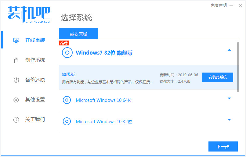 1、先在电脑上安装好装机吧一键重装系统软件并打开,然后就可以直接选择win7系统安装啦。(注意安装前备份好c盘的重要资料,最好能关闭电脑杀毒软件)