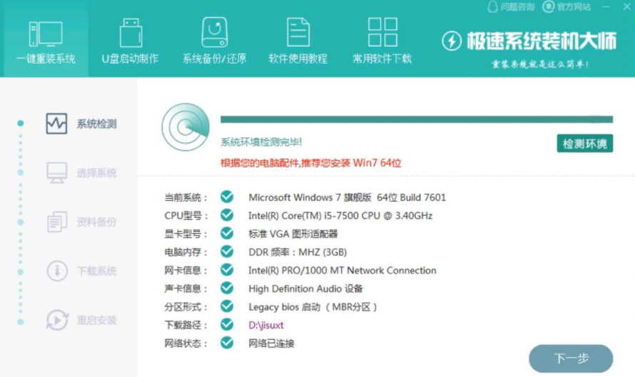 1、打开极速装机大师,等待检测系统环境,点击下一步。