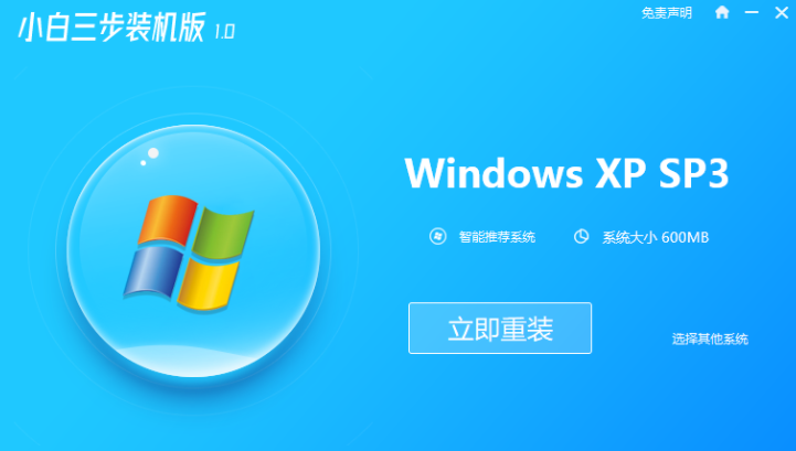 1、我们需要在小白官网中下载一个小白三步装机版工具,安装完成后打开软件,我们找到xp系统,点击右侧的立即重装。