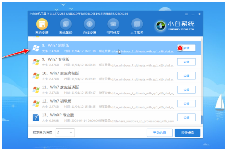 6、pe内,打开小白装机工具选择需要安装的系统执行安装,目标分区选择“C盘”。