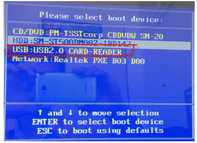 4、u盘插入需要重装的电脑,并重启电脑快速断续的按启动热键,一般是F12、F8、F9、F11、ESC,都可以逐一尝试,进入快速启动界面,选择带USB开头的u盘启动项回车键进入。