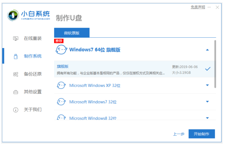 2、然后进入系统选择界面选择需要安装的系统,点击“开始制作”。