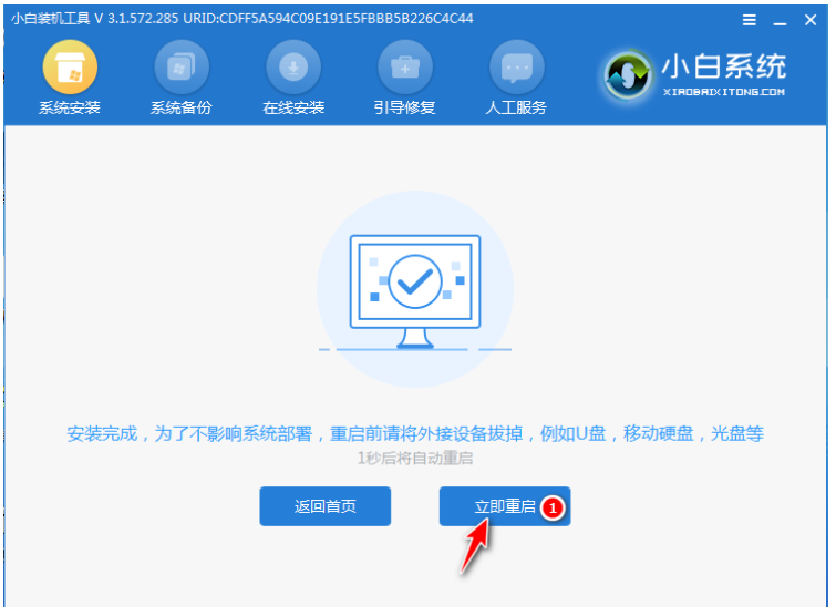 7、等待系统安装完成后,按照提示拔掉u盘重启电脑。