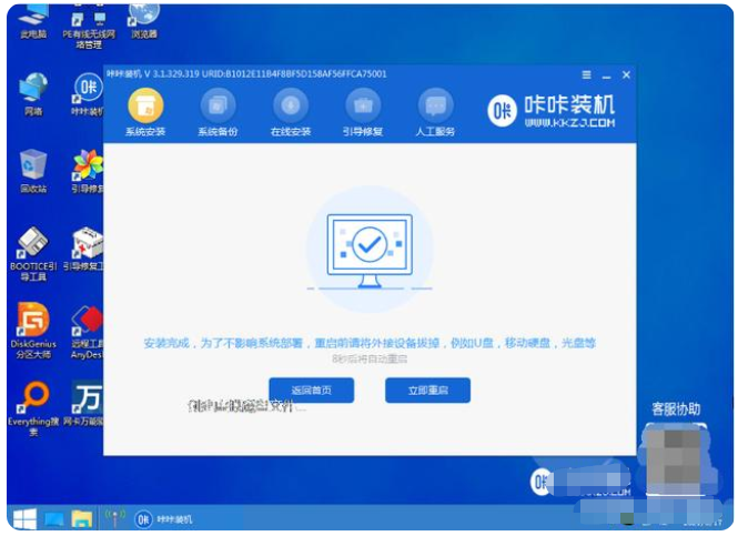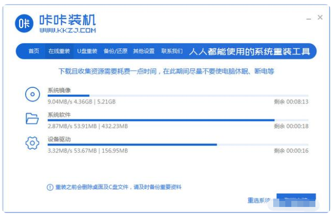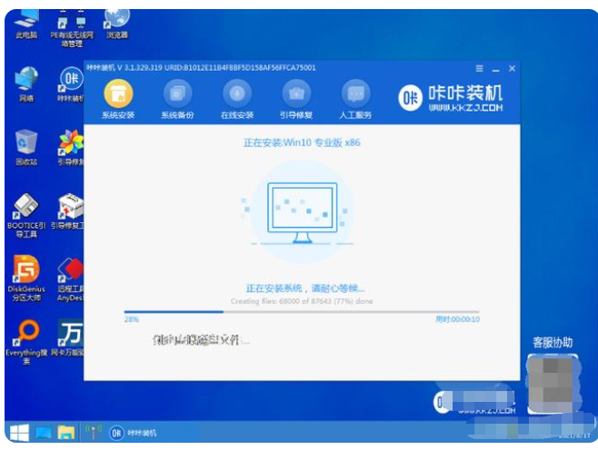 5、进入pe系统后,咔咔装机工具会自动开启并安装win10系统,耐心等待。