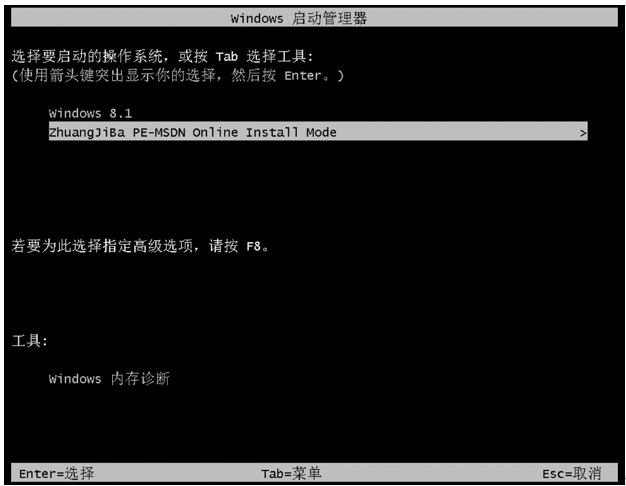 3、点击立即重启进入启动管理器页面,点击zhuangjiba pe选项,回车。