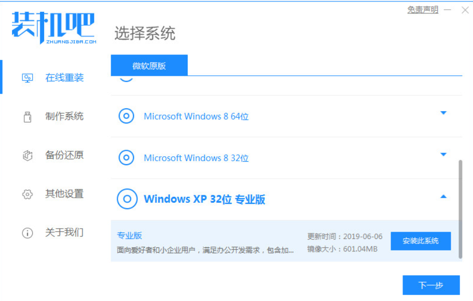 1、电脑下载安装装机吧系统软件系统,打开之后如下图。选择我们要安装的windows xp系统,如下图。