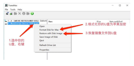 1)打开TransMac。右击U盘盘符,选择Format Disk for Mac选项