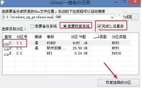 6.勾选“我要恢复系统”和“完成之后重启”;选择盘符分区号为“C”盘,点击“恢复选择的分区”。