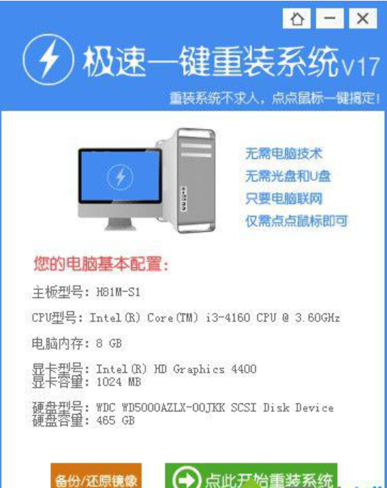 1、下载极速一键重装系统,之后打开主菜单,点击软件主界面的【点此开始重装系统】,如果你本机中已经有GHO镜像文件,则可以用【备份/还原系统】来还原;