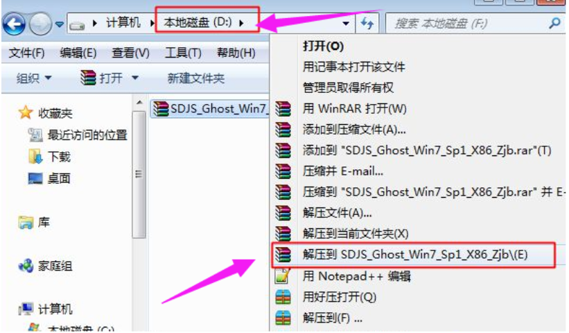 2.然后我们将ghost系统镜像解压到除C盘外的其他磁盘里面,保证磁盘空间足够解压。右键使用WinRAR等工具解压出来。