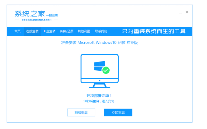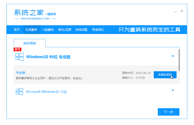 1、进入官网下载系统之家一键重装系统工具,双击打开,点击在线重装,选择需要安装的系统,点击安装此系统。