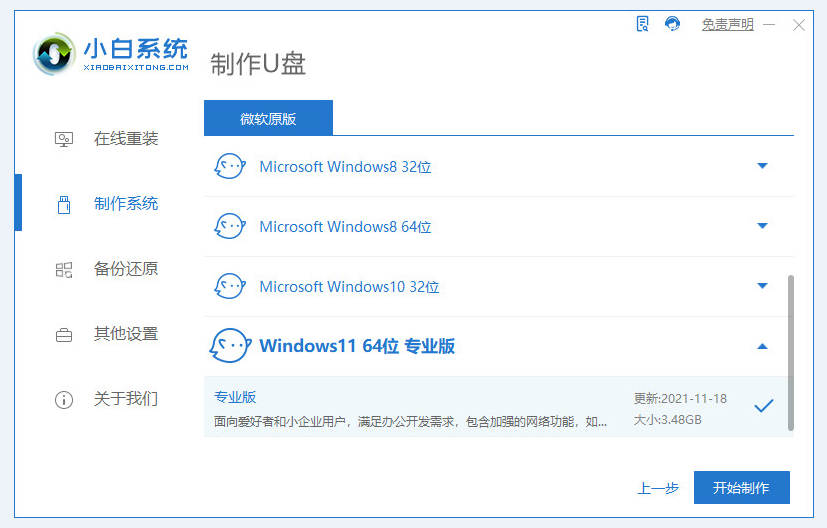 2、选择本次需要重装的windows11 64位,点击开始制作。