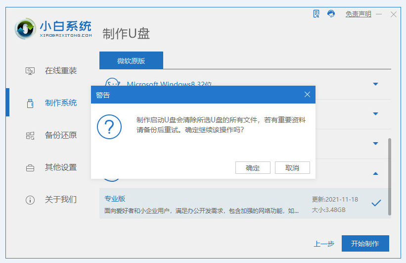 3、点击确定。(注意在制作u盘启动盘前要提前备份好重要数据,以防数据丢失。)
