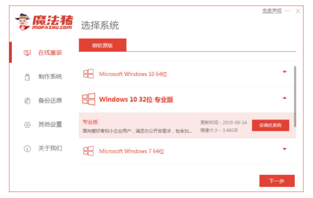 1、下载并运行魔法猪装机工具,选择想要的系统版本进行安装。