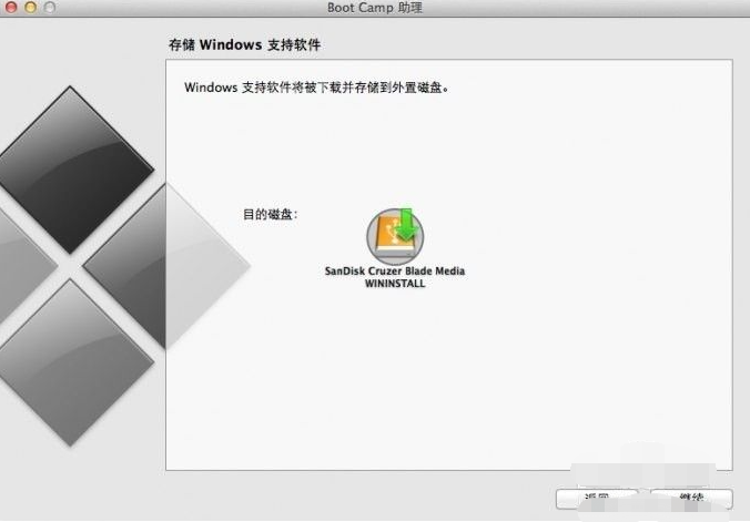 2、插入WIN 系统U盘到电脑,选择从Apple 下载最新的Windows 支持软件,点击继续,等系统自动下载Windows 驱动到U盘即可。