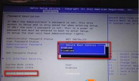 2、接下来点击SETUP进入到BIOS,然后在鼠标定位到Security页面,找到Secure BOOT Control这一段英文,然后回车确认将Enabled改为Disabled。