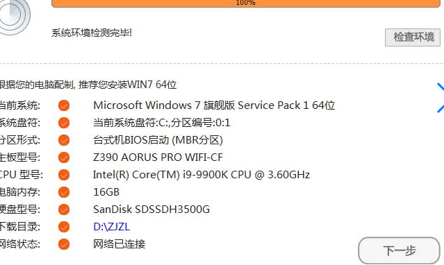 总结:下载系统,检测环境,点击下一步重装完成。
