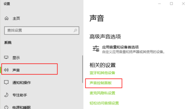 2、选择“打开声音设置”选项,点一下“声音控制面板”。