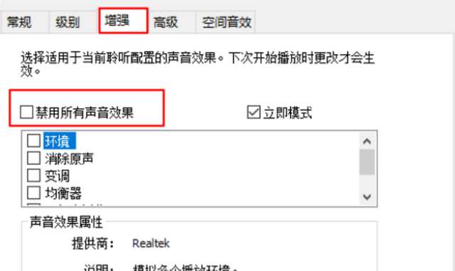 4、点一下“增强”菜单的选项,取消勾选“禁用全部声音效果”,随后点一下“确定”。