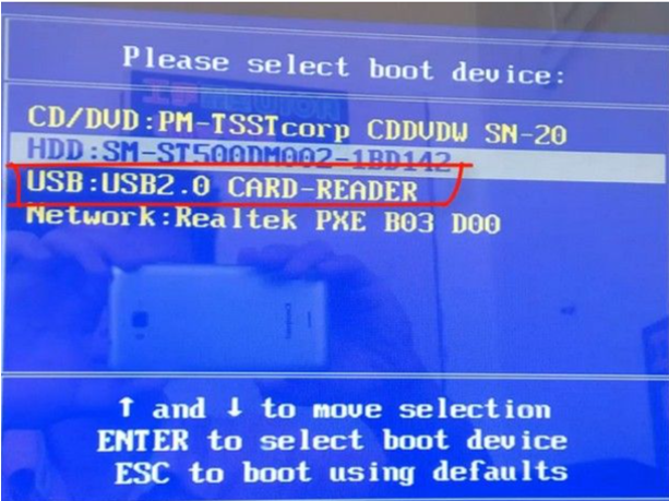 6、将u盘插入要装系统的电脑,开机按热键进入启动项,选择USB项,按回车。