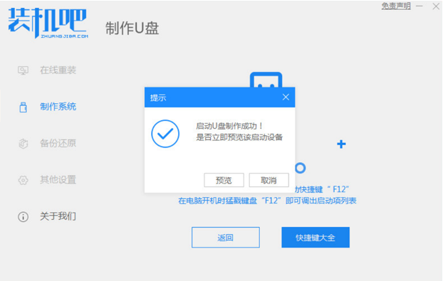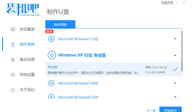 1、在惠普电脑上下载安装好装机吧一键重装系统工具并打开,插入U盘,选择制作系统,点击开始制作。