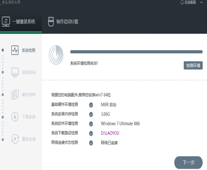 1.打开老友一键重装系统软件,自动检测完成后,单击右下角的“下一步”。