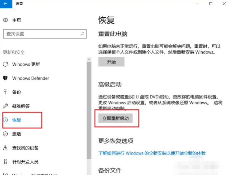 2、然后切换至【恢复】选项下,点击高级启动下的【立即重新启动】按钮。