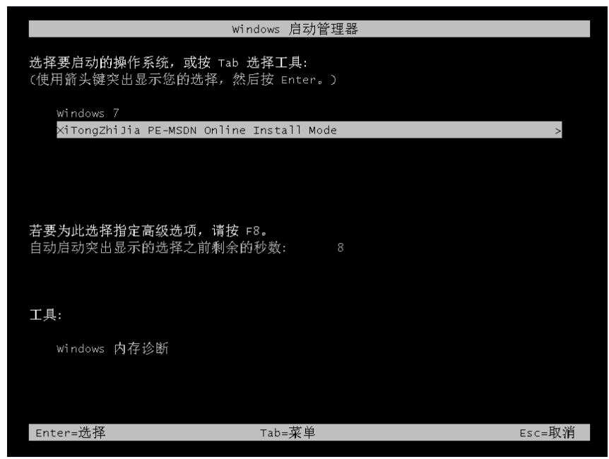 5、重启后会进入到windows启动管理器页面,选择第二个进去pe系统安装页面。