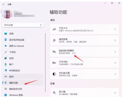 进入到设置窗口后,在左侧找到“辅助功能”,再点击右侧鼠标指针和触控。