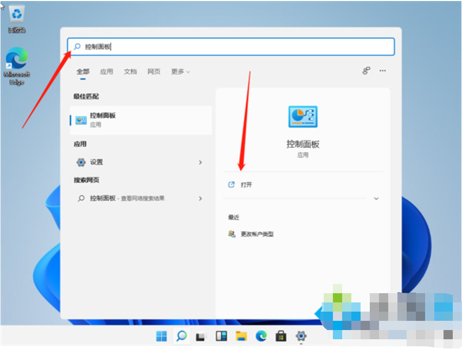 2、在搜索栏中输入【控制面板】,然后点击如图的打开即可。