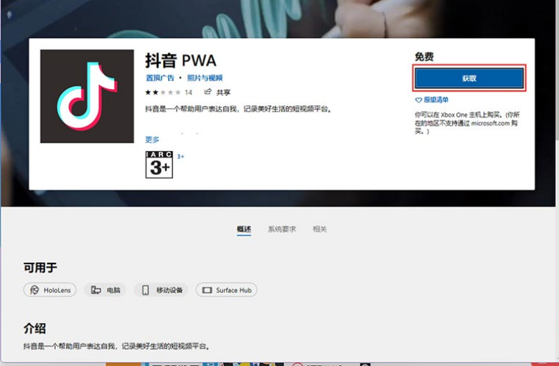 4、在抖音打开页面中,点击右上角的获取。