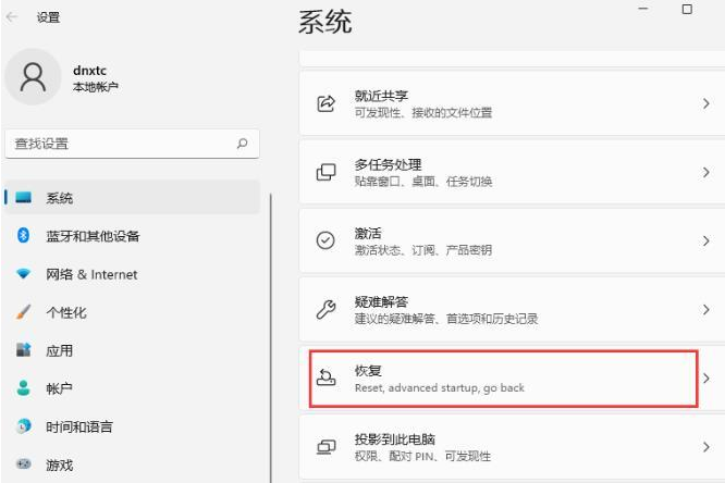 1.首先我们打开系统设置,在左边的系统中选择“恢复”。